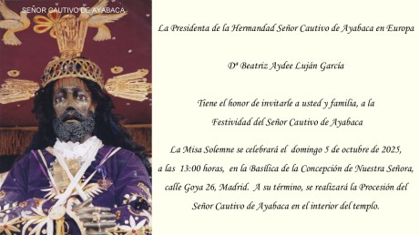 La Misa Solemne se celebrará el domingo 5 de octubre de 2025, a las 13:00 horas, en la Basílica de la Concepción de Nuestra Señora, calle Goya Nº 26 - Madrid. A su término, se realizará la Procesión dentro del templo.